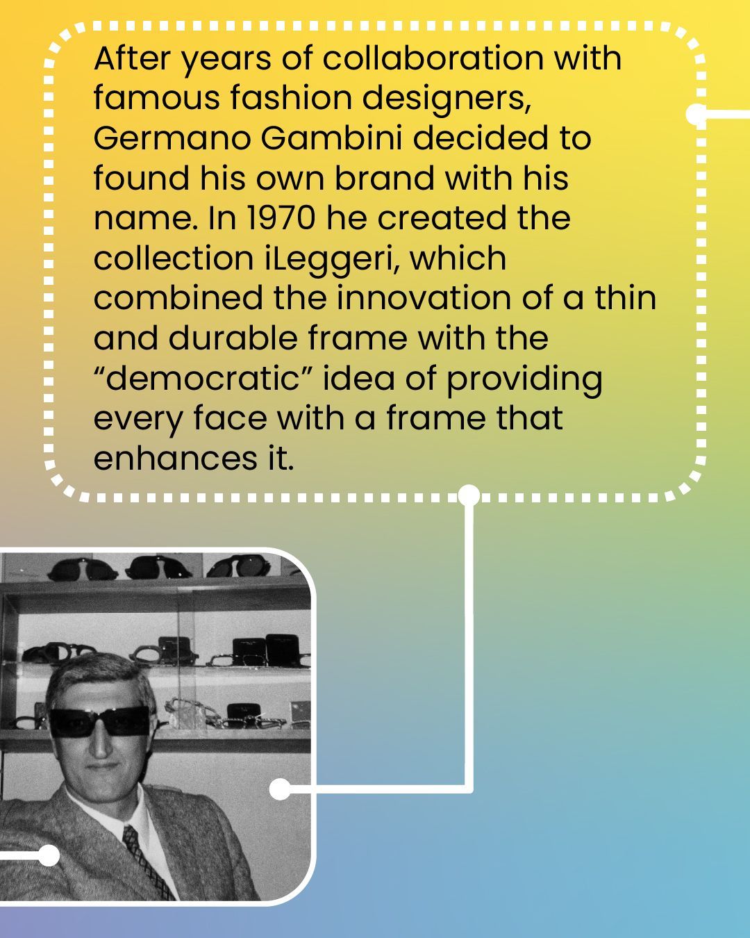 Scegliere un rivenditore del marchio Germano Gambini significa affidarsi a una tradizione tutta italiana fatta di stile, qualità e innovazione. Dopo anni di collaborazione con celebri stilisti, Germano Gambini fonda il proprio marchio e nel 1970 crea la collezione iLeggeri, che unisce l’innovazione di una montatura sottile e resistente all’idea “democratica” di valorizzare ogni viso. Gli occhiali Germano Gambini sono un simbolo di eleganza senza tempo, caratterizzati da design raffinato, materiali pregiati e comfort assoluto. L’eredità del fondatore, fatta di passione, curiosità e ricerca costante dell’eleganza, continua ancora oggi e ispira ogni creazione. Nel nostro showroom potrai scoprire le collezioni più iconiche e le ultime novità, veri e propri segni distintivi di stile.